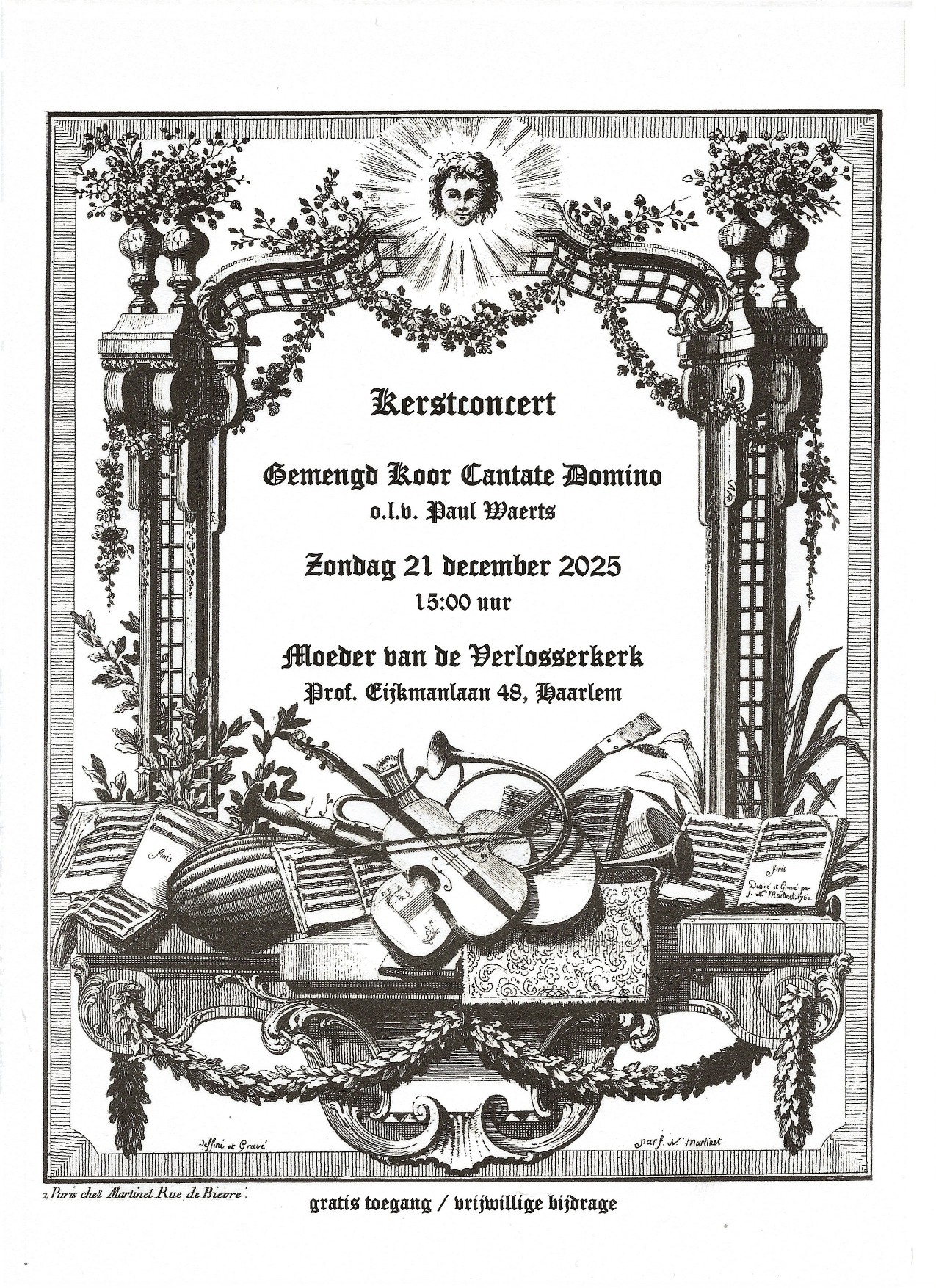 Gemengd koor Cantate Domino geeft op 21 december vanaf 15.00 uur een kerstconcert in de Moeder van de Verlosserkerk, Prof Eijkmanlaan 48,2035 XB Haarlem. Komt u ook – samen met familie of vrienden - naar dit concert van Cantate Domino?! Er klinken die middag mooie Christmas Carols en traditionele kerstliederen. Uiteraard is er ook samenzang en een prachtig kerstverhaal.