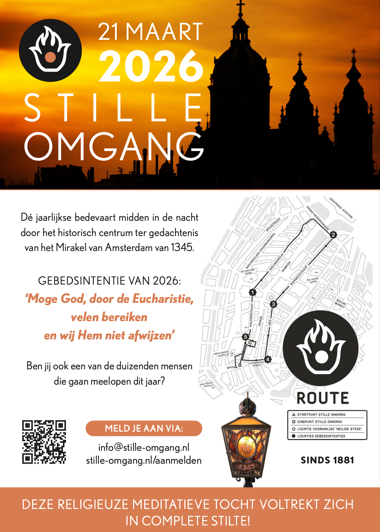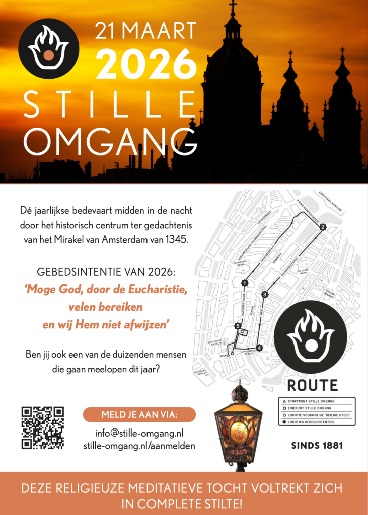De Stille Omgang vindt plaats in de nacht van zaterdag 21 op zondag 2 2maart. Het is een nachtelijke stille pelgrimstocht door het centrum van Amsterdam en volgt de route die de pastoor van de Oude Kerk in 1345 liep, nadat hij getuige was geweest van een Eucharistisch wonder dat aan een zieke geschiedde: het Mirakel van Amsterdam. Ter verdieping heeft de Stille Omgang 2026 als intentie: